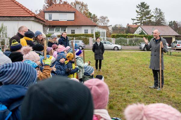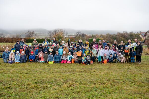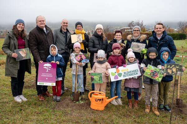 Alle acht Klassen der Volksschule Gumpoldskirchen bereichern eine 6.900m² große Wiese nahe der Schule mit zahlreichen Streuobstbäumen und heimischen Heckensträuchern sowie Steinhaufen – der Start für eine langfristige ökologische Gestaltung der Fläche und Beschäftigung mit der Natur. Dabei werden sie von den Biolog:innen des Landschaftspflegevereins Thermenlinie-Wiener Becken und dem Naturpark Föhrenberge unterstützt. Die Marktgemeinde Gumpoldskirchen stellt die Fläche sowie laufende Erhaltungsmaßnahmen bereit.