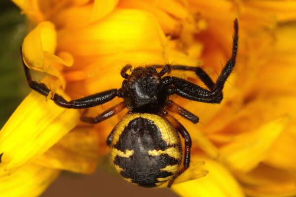 - Hinterleib kreisrund, hellgelb oder rötlich, mit breiter, schwarzer Zeichnung
