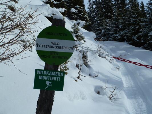 Konflikte entstehen immer wieder, wenn FreizeitsportlerInnen (Skitourengeher, Schneeschuhwanderer) den Fütterungen zu nahekommen oder mitten durch das Einstandsgebiet fahren. Hier können behördlich verordnete „Wildruheflächen“ erlassen werden. Aber auch Lenkungsprojekte, Aufklärung sowie die Kennzeichnung von Einstands-und Fütterungsstellen vor Ort und im Kartenmaterial sollen zu einem besseren Miteinander beitragen. In einigen viel frequentierten Gebieten in Tirol zeigen diese Maßnahmen erste Erfolge.