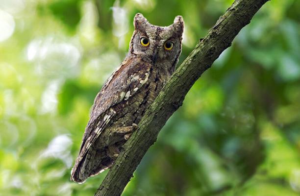 Otus scops, so der wissenschaftliche Name, ist nach dem Sperlingskauz die kleinste aller europäischen Eulenarten. Mit einer Körperlänge von etwa 20 cm ist die Zwergohreule kaum größer als eine Amsel. Ein bisschen imposanter wirkt unser kleiner Teufel wenn er aufgeregt ist und seine "Hörner" aufstellt. Das Gefieder der Zwergohreule ist im Grunde grau oder bräunlich, die Zeichnung mit dunklen und hellen Streifen gibt dem Vogel die Farben von Baumrinde. Somit ist unsere Freundin eine Meisterin der Tarnung! Sie an einem Stamm oder Ast entdecken zu wollen, gleicht der Suche nach einer Nadel im Heuhaufen.