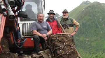 Franz Bergler (Bildmitte) ist gelernter Maschinenschlosser. Er wächst mit Tieren auf, ist im Sommer als Halter auf der Wildenseealm im Ausseerland, und studiert an der Universität für Bodenkultur in Wien Landwirtschaft. Zuerst an einer universitären Karriere interessiert, holt ihn sein Vorgänger 1990 als Fachmann in den Landesdienst, wo er sich seitdem um die steirischen Almen kümmert. Er ist einer von vier Alminspektoren in Österreich. In Vorarlberg und Oberösterreich haben Almbeauftragte die Bundesländeralmen über. In Salzburg kümmert sich der Leiter des Referats für Agrarwirtschaft, Bodenschutz und Almen um die Alm-Agenden. Auf dem Bild rechts ist Bergler mit einem Arbeiter und dem Almbauer nach einer Triebwegsanierung auf der Funklalm zu sehen.