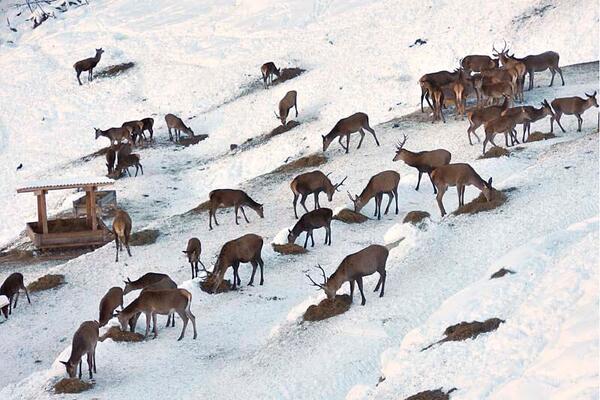 Denn das Rotwild knabbert gerne an den Trieben von jungen Bäumen, v. a. an Laubhölzern und Tanne. Diese können dadurch absterben. Was ungünstig ist, weil der Wald gerade hier im Gebirge Häuser, Straßen oder Bahnstrecken schützt: vor Lawinen, Steinschlag und Hangrutschungen. Mit klug positionierten Winterfütterungen kann man das Rotwild zumindest in unbedenklichere Waldregionen lenken.