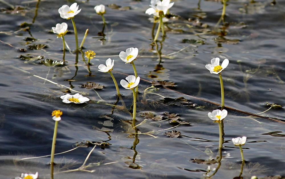 Am Zauner See findet man auch den Wasserhahnenfuß (Ranunculus convervoides), der nur in alpinen Seen vorkommt. Er blüht auch unter Wasser und – sorry Bienen - er bestäubt sich selber, um Samen zu produzieren.
