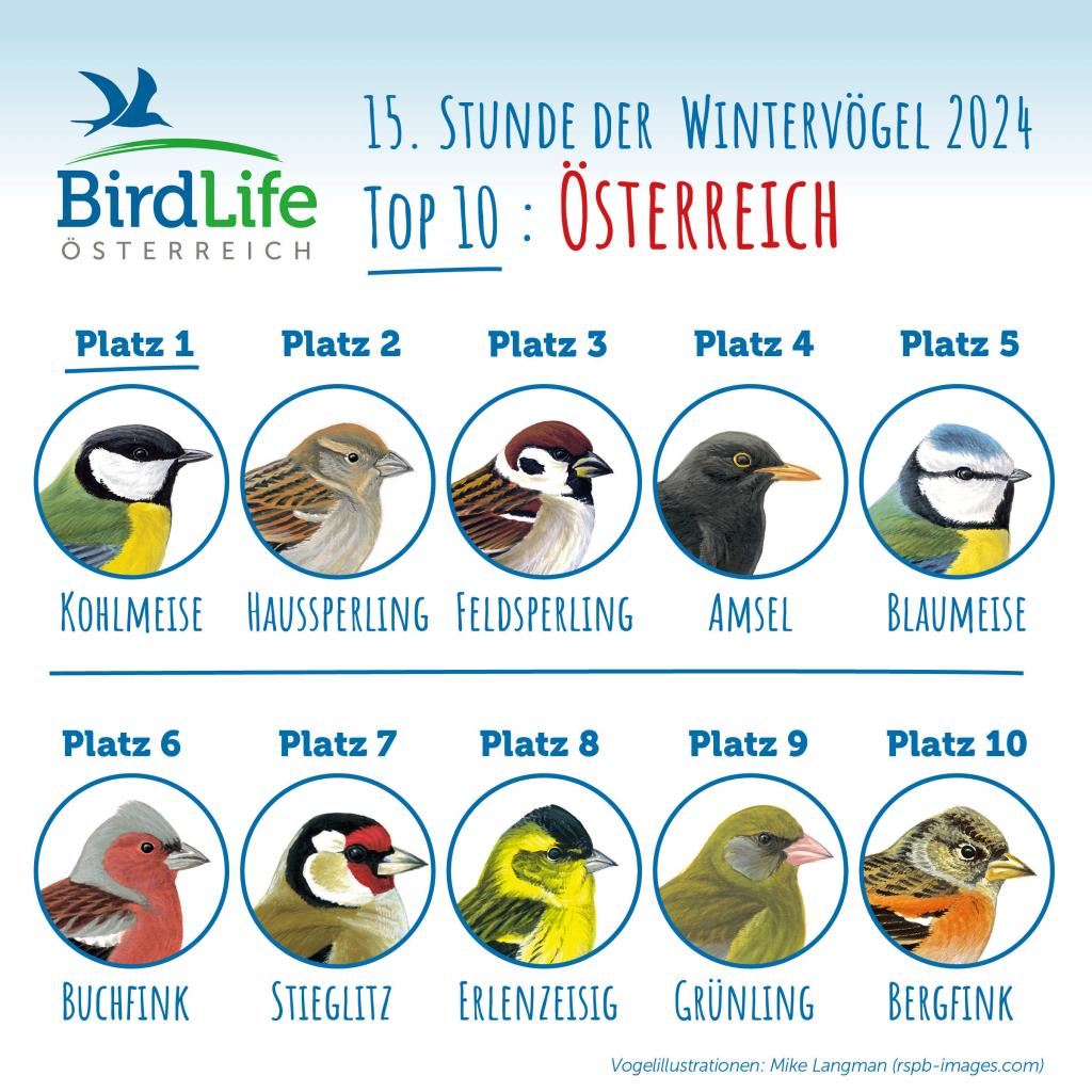 Bei der heurigen Jubiläumszählung war die Kohlmeise Österreichs häufigster Siedlungsvogel. Mit 5,3 Individuen pro Garten wurde sie in 89,4% der Gärten gesichtet und verwies den Vorjahressieger Haussperling (umgangssprachlich: Hausspatz) und den Feldsperling (umgangssprachlich: Feldspatz) auf die Plätze zwei und drei. Seit Anbeginn der winterlichen Zählungen sind diese drei Arten die häufigsten Vögel im winterlichen Siedlungsraum. Die heurigen Beobachtungen zeigten sich um knapp 2 (1,8) Kohlmeisen mehr in den Gärten als in den Vorjahren. Der Haussperling und der Feldsperling traten ähnlich häufig auf wie in den Vorjahren. Der Haussperling flog in 45,6%, der Feldsperling in 42,1% aller Gärten. Die Amsel flatterte auf Platz vier und war im Vergleich zum Vorjahr in allen Bundesländern um ¼ (26,8%) häufiger anzutreffen. Innerhalb Österreichs wurde ein „Süd-Nord-Gefälle“ festgestellt: Im Süden des Bundesgebietes, in Kärnten, Steiermark, Südburgenland und Osttirol, waren deutlich mehr Vögel pro Garten zu beobachten. In den südlichen Bundesländern Kärnten und Steiermark waren durchschnittlich 38,4 Vögel pro Garten zu sehen. Dieses Phänomen kann seit Beginn der Zählreihe festgestellt werden – viele Kurzstreckenzieher und Teilzieher halten sich im Winter eher südlich des Alpenhauptkamms oder auch südöstlich des Alpenraumes auf als nördlich davon.