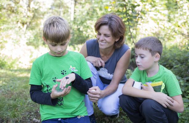 Die Naturparkbiologin führt die Kinder durch den Wald. Hier dicht und dunkel, kaum Bewuchs am Boden. Dort, wo Licht durchflutet – ein Teppich aus Blüten. Im lichten Bereich summt, krabbelt, flattert es.